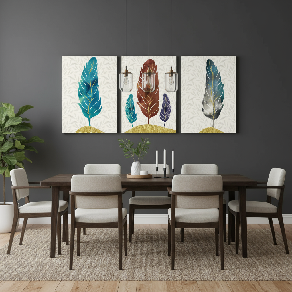 Bring elegance, color, and modern style to your walls with this Abstract Colorful Feather Canvas Set of 3. Featuring bold feather designs in shades of blue, maroon, and gold accents on a neutral patterned background, this wall art set creates a perfect balance of vibrancy and sophistication.