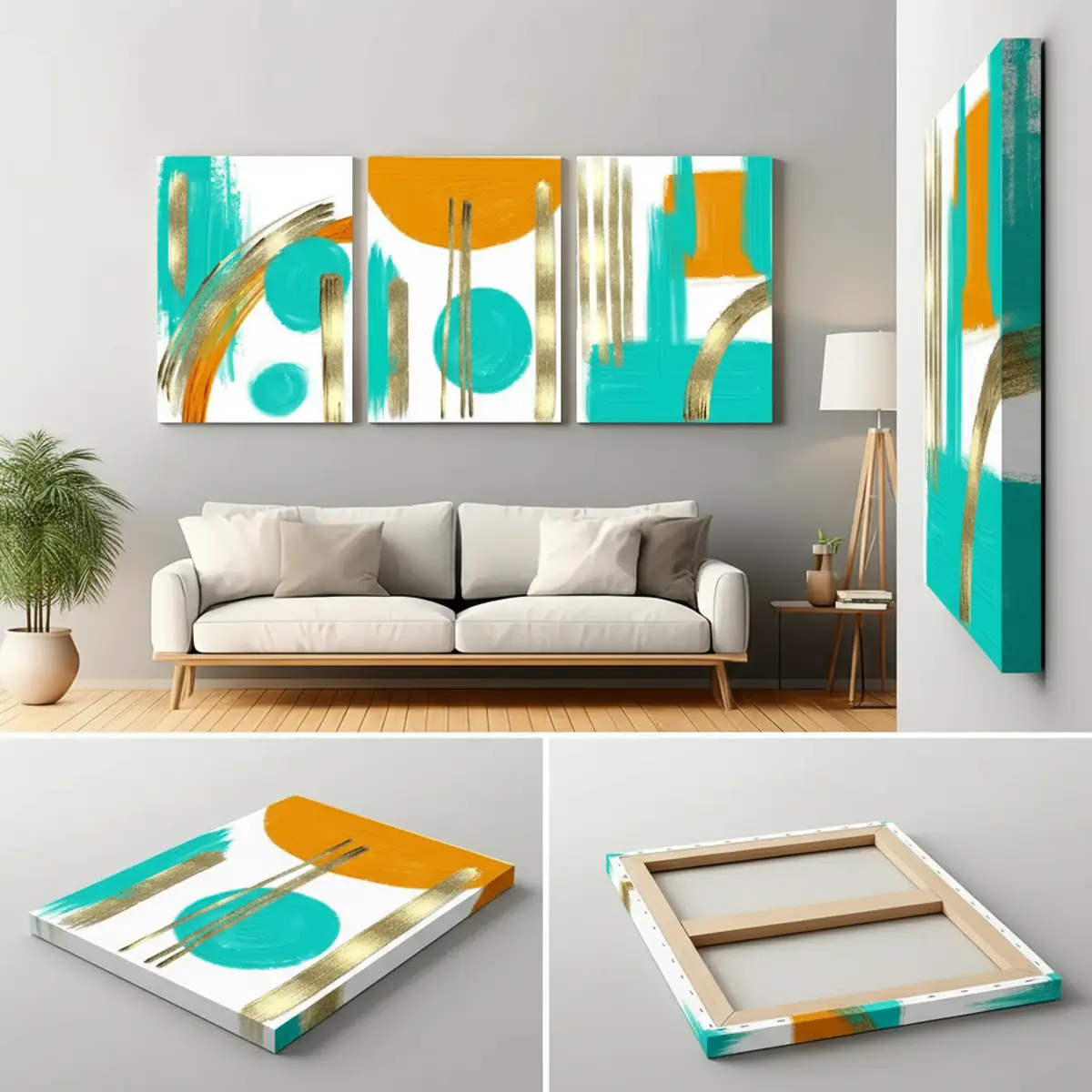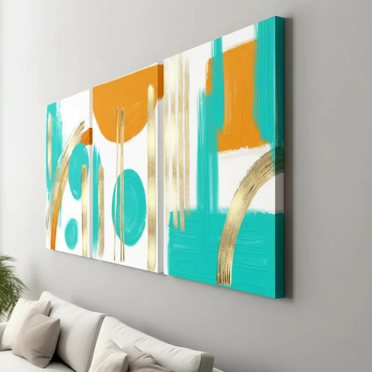Featuring bold brush strokes in turquoise blue, warm orange, and shimmering golden accents, this artwork creates a stunning balance of modern design and rich sophistication.