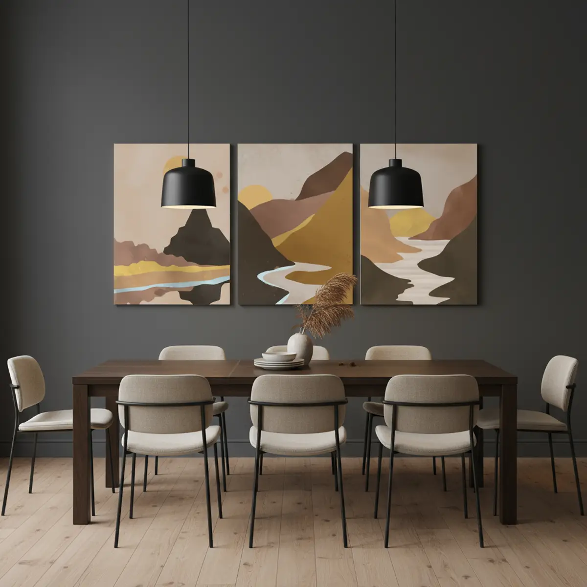 Bring the calmness of nature and the beauty of landscapes into your home with this Abstract Mountain Landscape Canvas Set of 3. Designed with earthy tones, flowing river patterns, and minimalist mountain silhouettes, this triptych artwork adds a soothing and modern vibe to any interior.