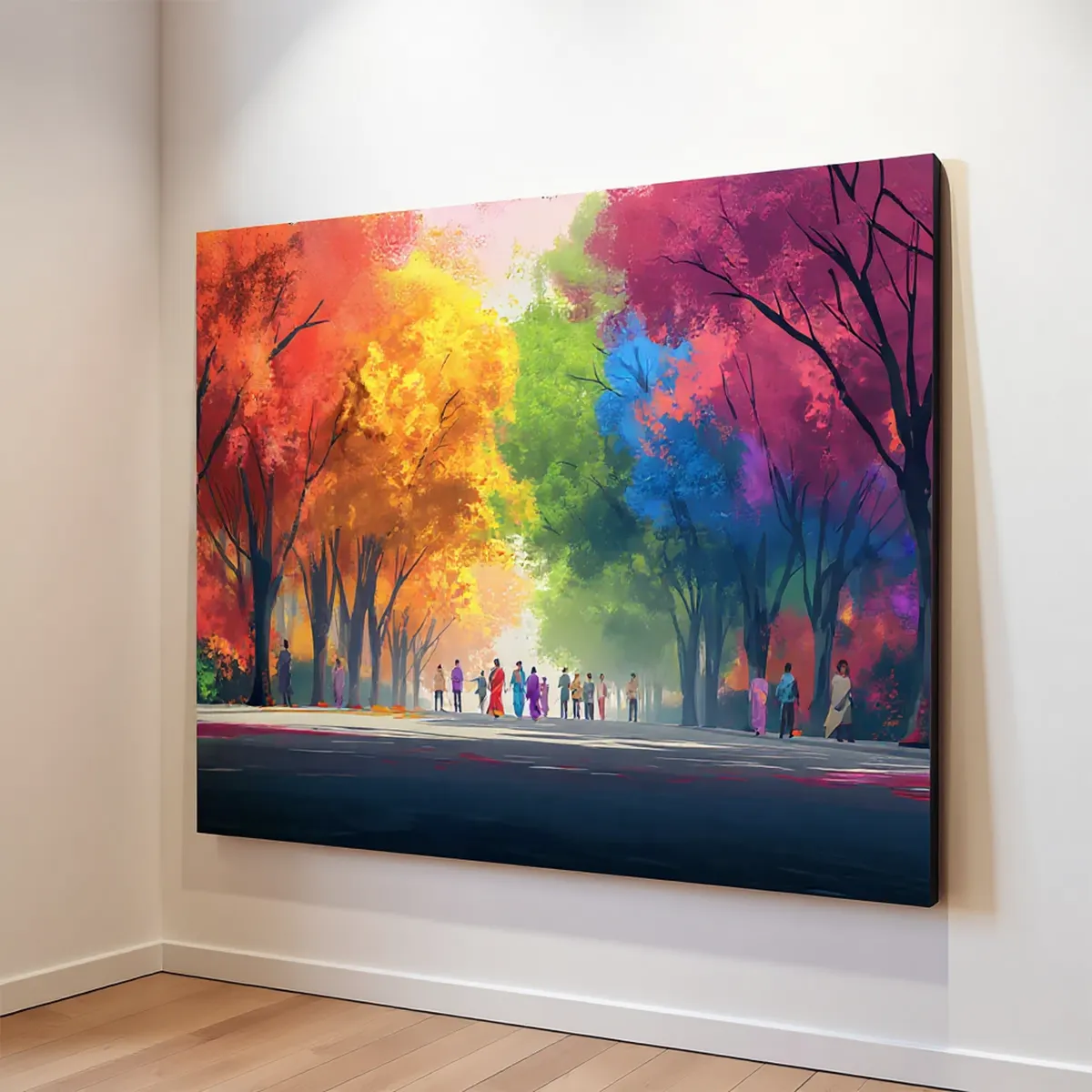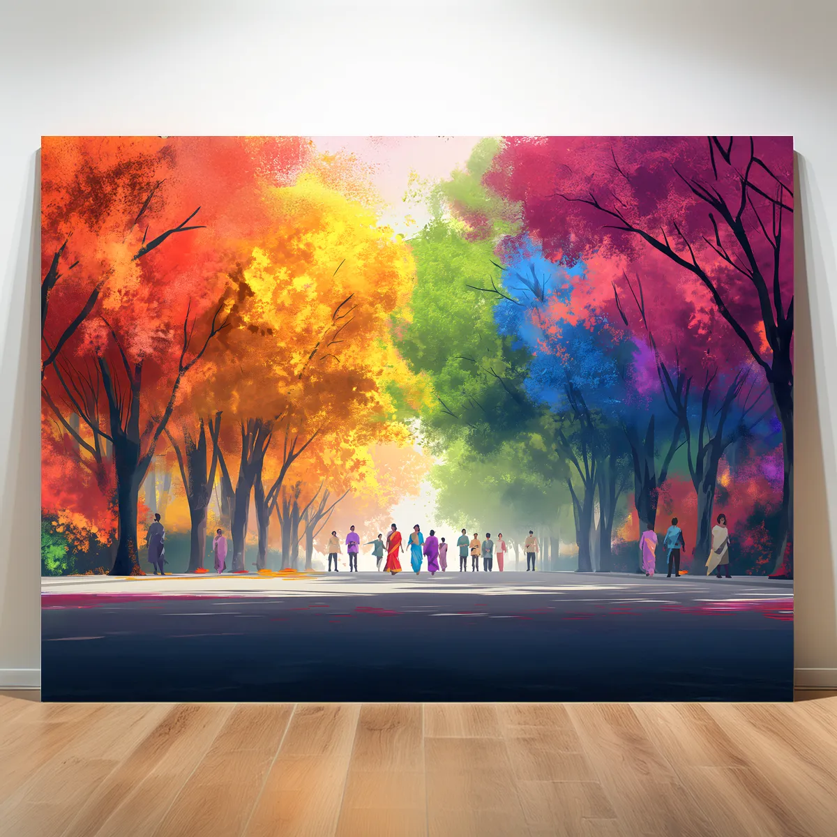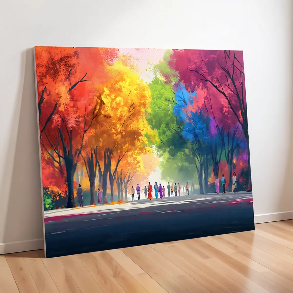 Transform your home into a colorful masterpiece with this stunning abstract street canvas wall art, featuring a lively pathway surrounded by bright red, yellow, green, and blue trees. The unique artistic design with people walking in harmony symbolizes joy, culture, and togetherness – making it the perfect centerpiece for your home or office décor.