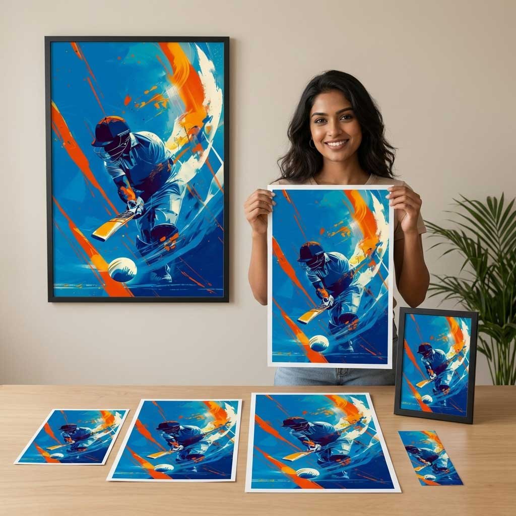 cricket batsman poster featuring a powerful action shot in vibrant abstract style. Premium HD sports wall art available in A5, A4, 12×18 & 18×24 sizes.