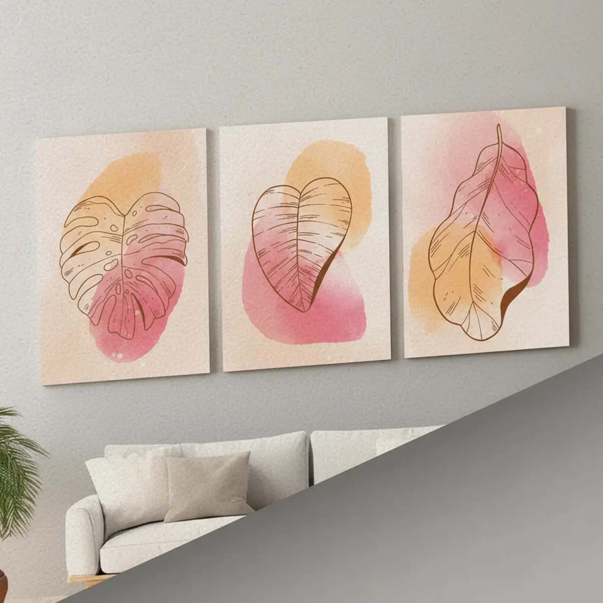 Each set includes 3 canvases (22 inches wide x 30 inches tall each) featuring elegant botanical leaf illustrations with soft pink and golden watercolor accents.