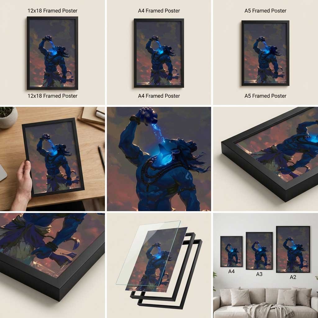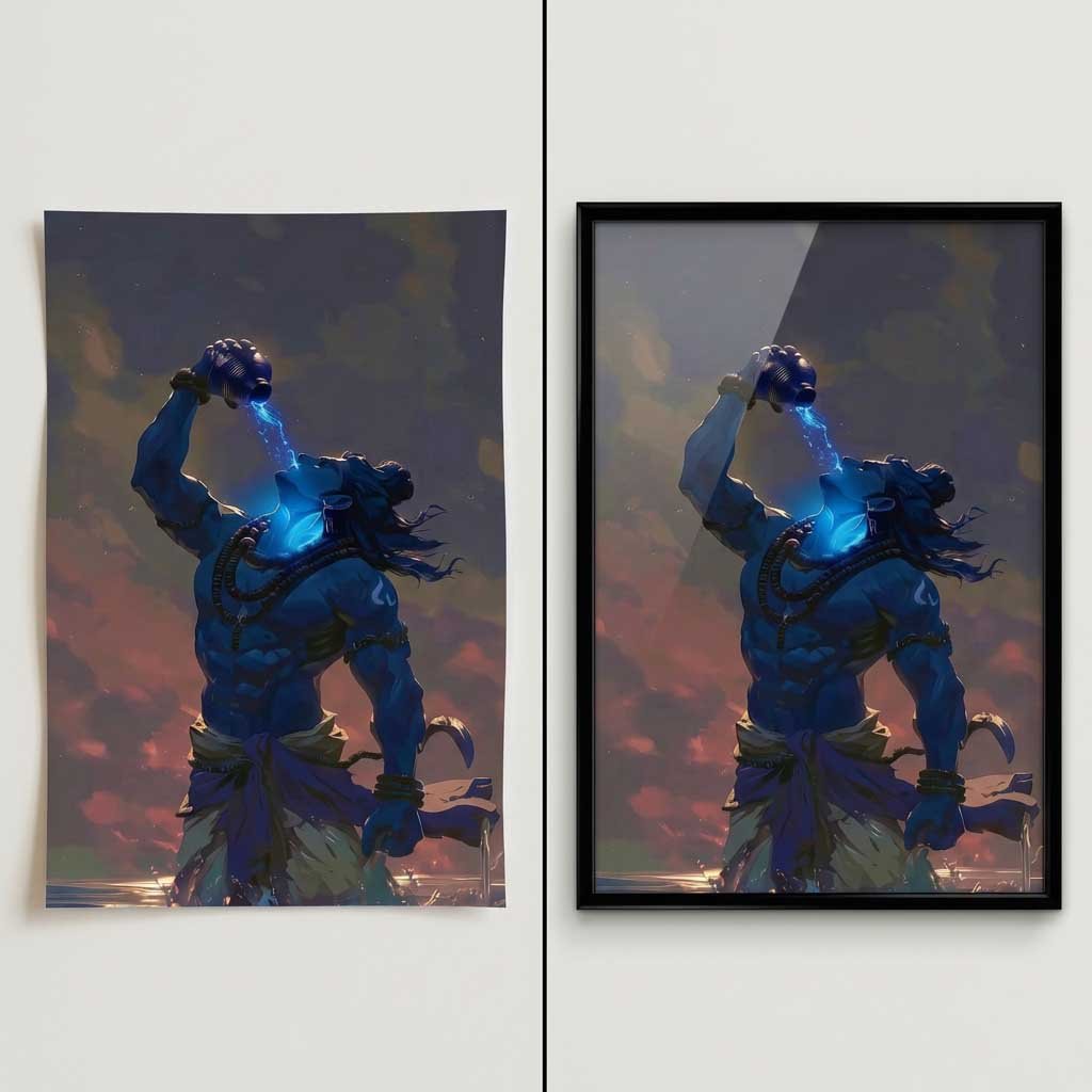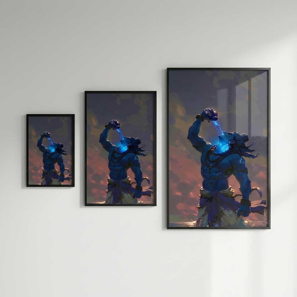 Powerful Lord Shiva Neelkanth poster showing Mahadev drinking Halahala poison. Premium HD spiritual wall art available in A5, A4 & 12×18 sizes. Perfect for home temple and Shiva devotees.