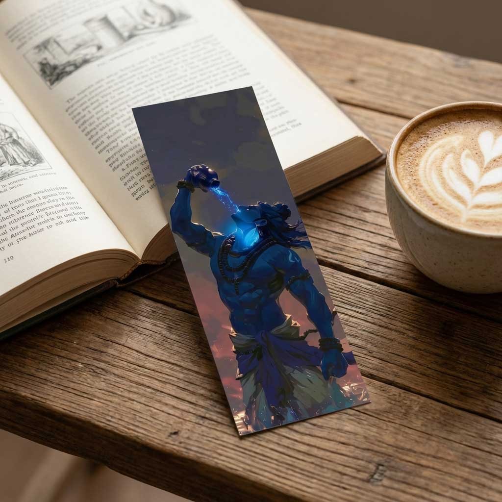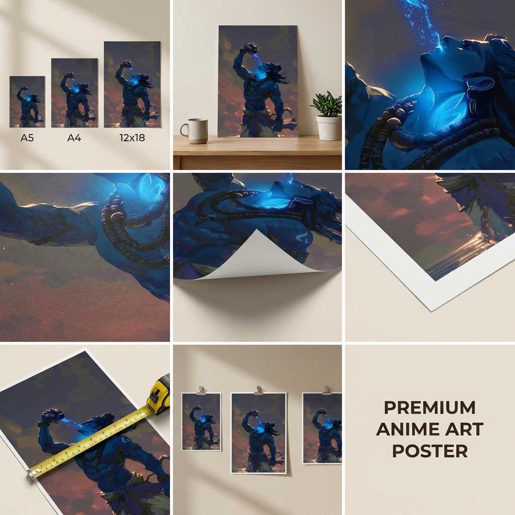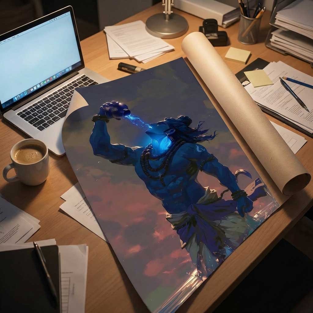 Powerful Lord Shiva Neelkanth poster showing Mahadev drinking Halahala poison. Premium HD spiritual wall art available in A5, A4 & 12×18 sizes. Perfect for home temple and Shiva devotees.