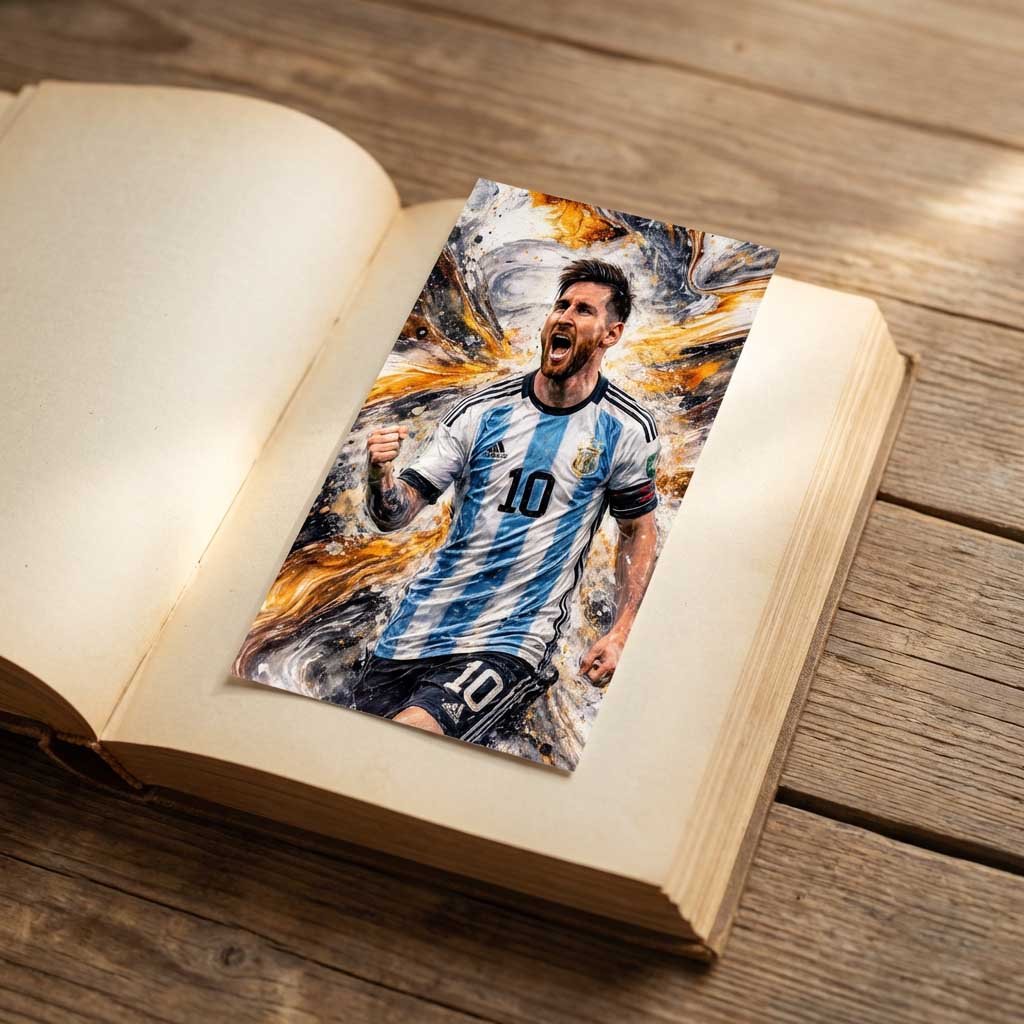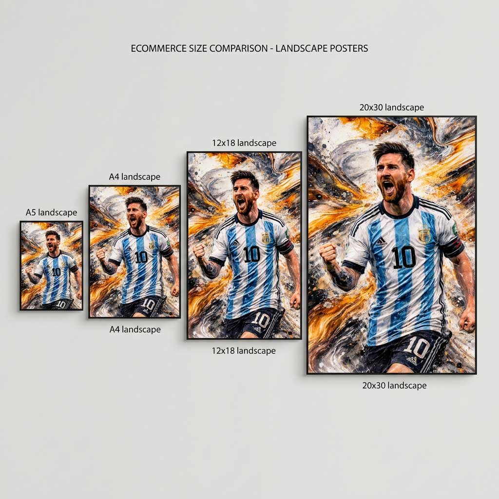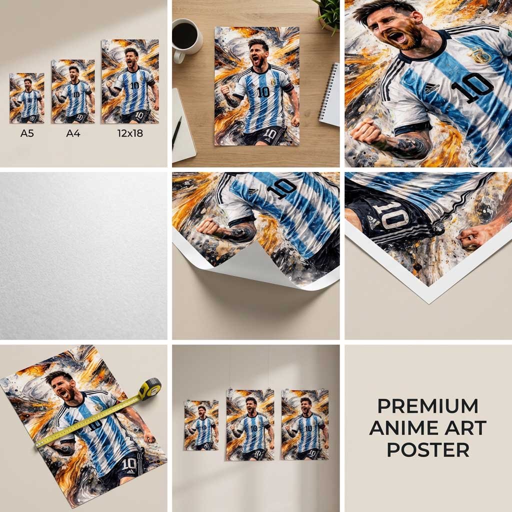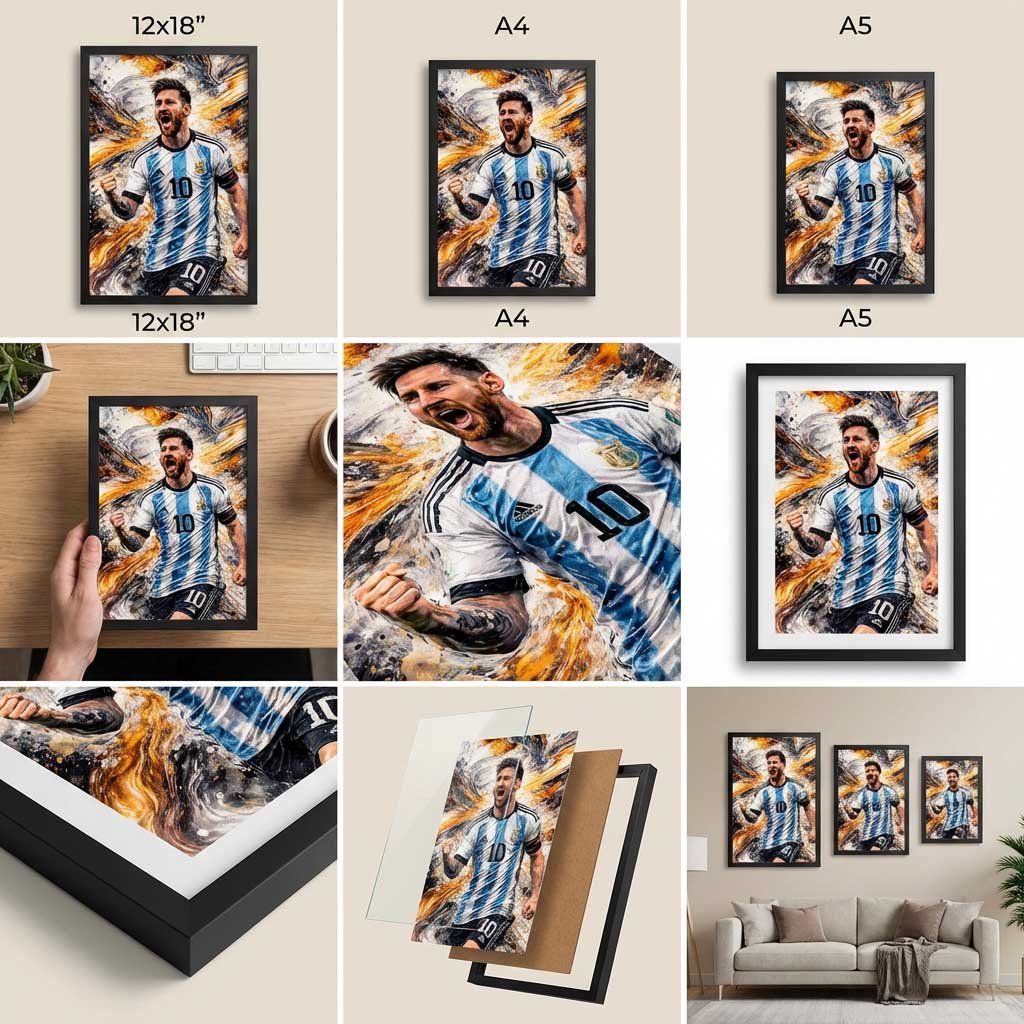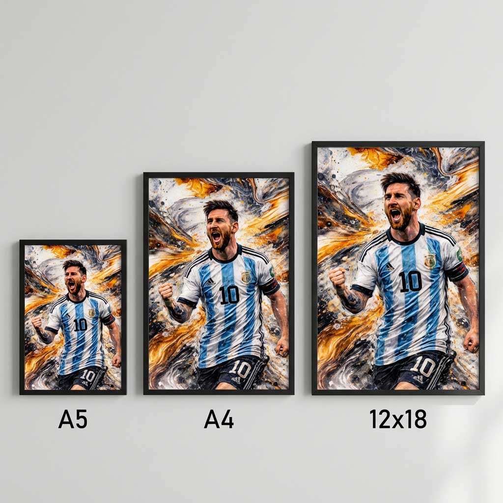Messi celebration poster featuring the Argentina football legend. Premium HD sports wall art available in A5, A4, 12×18 & 18×24 sizes.