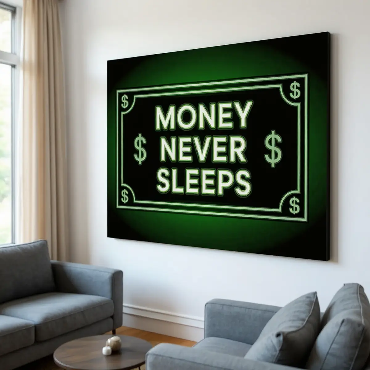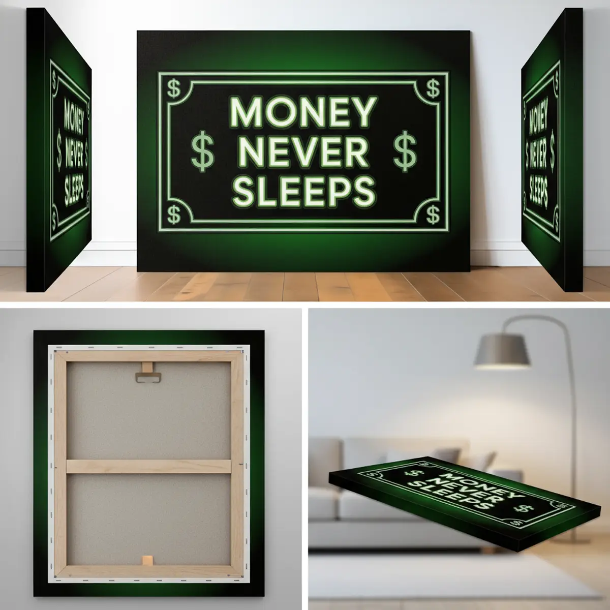 Money Never Sleeps Wall Art | Neon-Inspired Motivational Canvas Painting (All Sizes Available)